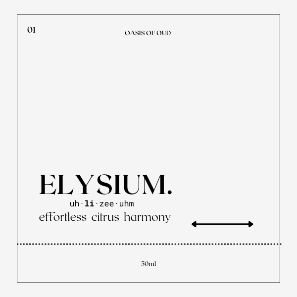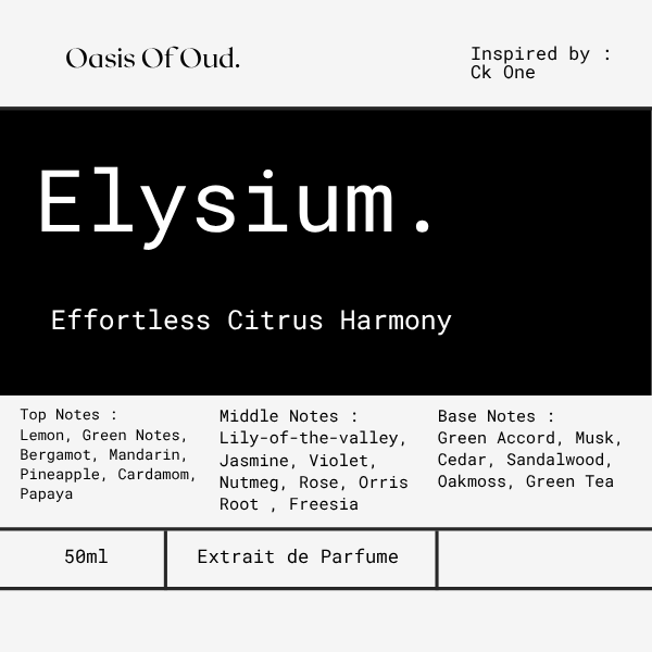 Elysium is a fragrance that embodies vitality, clarity, and effortless harmony. It opens with an invigorating burst of lemon, bergamot, pineapple, and mandarin, softened by delicate papaya and cardamom. At its heart lies a luminous bouquet of lily-of-the-valley, jasmine, violet, and freesia, enriched with subtle spices and rose. The base anchors with green tea, oakmoss, cedar, and sandalwood, creating a scent that is both refreshing and grounding.