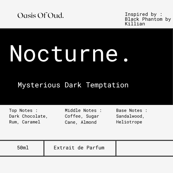 Step into the night with Nocturne, a seductive symphony of rich gourmand notes and midnight allure. It opens with intoxicating dark chocolate, rum, and caramel, moving into roasted coffee, sugarcane, and almond. A warm base of sandalwood and heliotrope completes the composition. Decadent and mysterious, Nocturne is made for evening wear and unforgettable encounters.